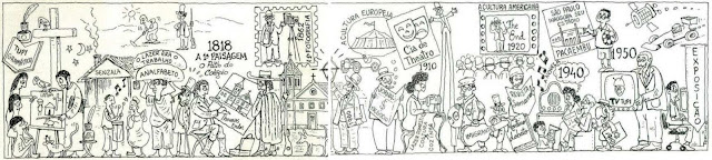 Entre as edições especiais que guardei da data, a Revista da Folha publicou uma longa matéria sobre o cotidiano paulistano, ilustrada em formato de linha do tempo pelo cartunista Terciano. Seguem as tirar, sempre sob o tema A Breve História de São Paulo no ...